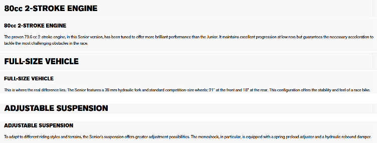 Taller, more stable and more powerful. The EVO 80 Senior is the natural choice for young riders who have moved beyond the learning stage and are looking for a bike that can support their competitive growth. The 21‘ and 18’ wheels and the frame derived from larger displacement models allow them to set their trajectories and overcome obstacles with the precision of a true professional.