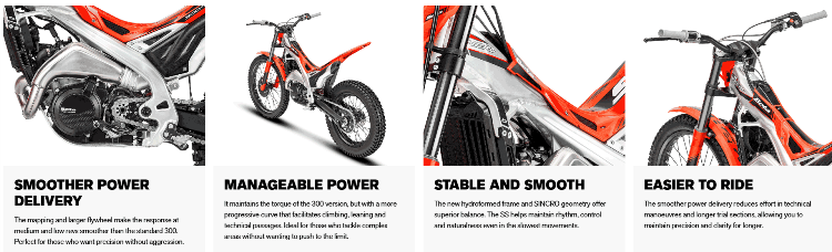 The SINCRO 300 SS was created to offer all the torque and solidity of the 300 engine, but with smoother and more progressive power delivery at medium and low revs. A motorcycle designed for those who want usable power, smooth riding and maximum ease in overcoming obstacles without effort. Perfect for the advanced amateur and for those looking for a more docile, intuitive and fun 300.